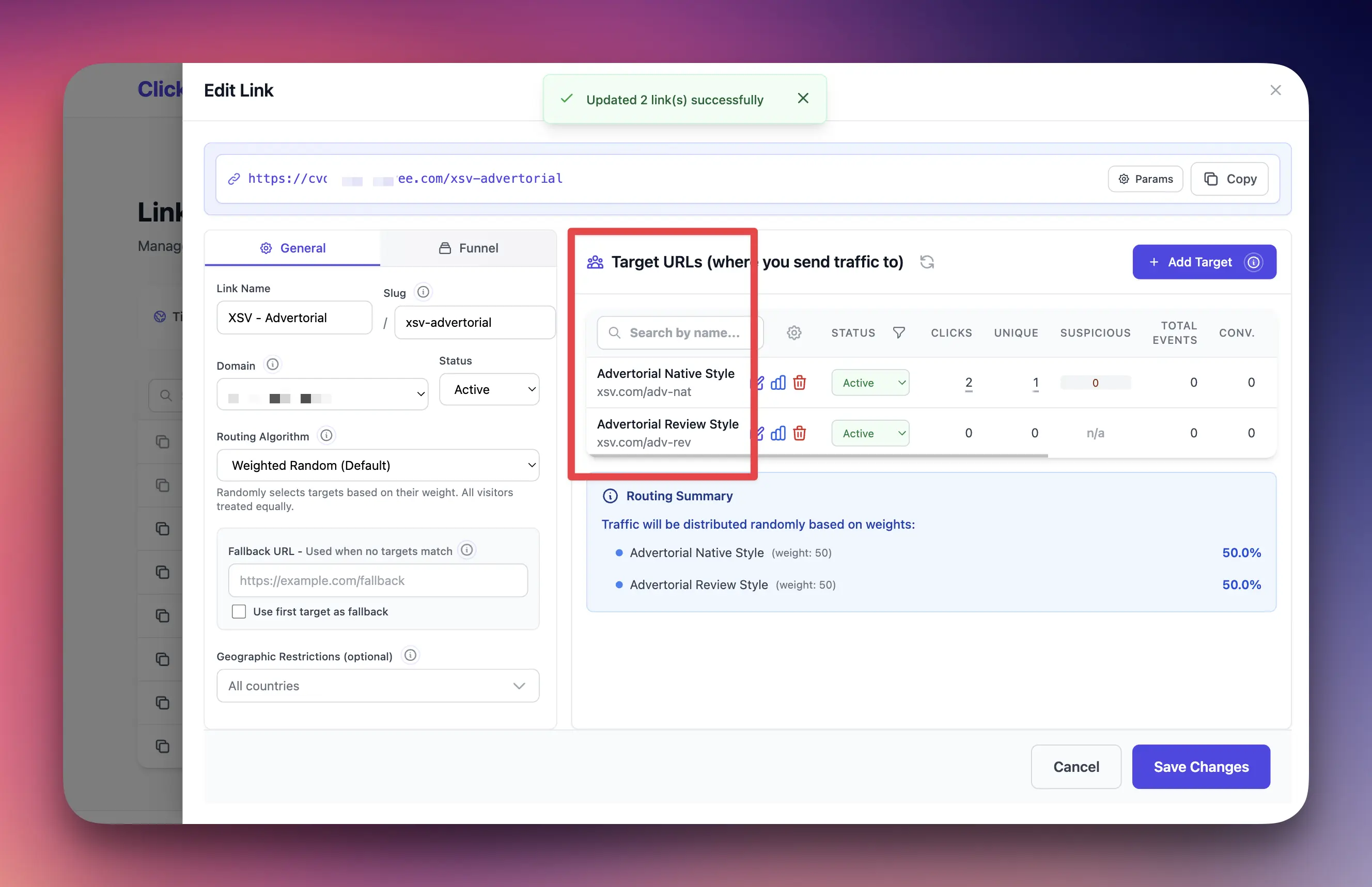 Targets are the destination URLs where you want to send your visitors. Each tracking link can have one or more targets.