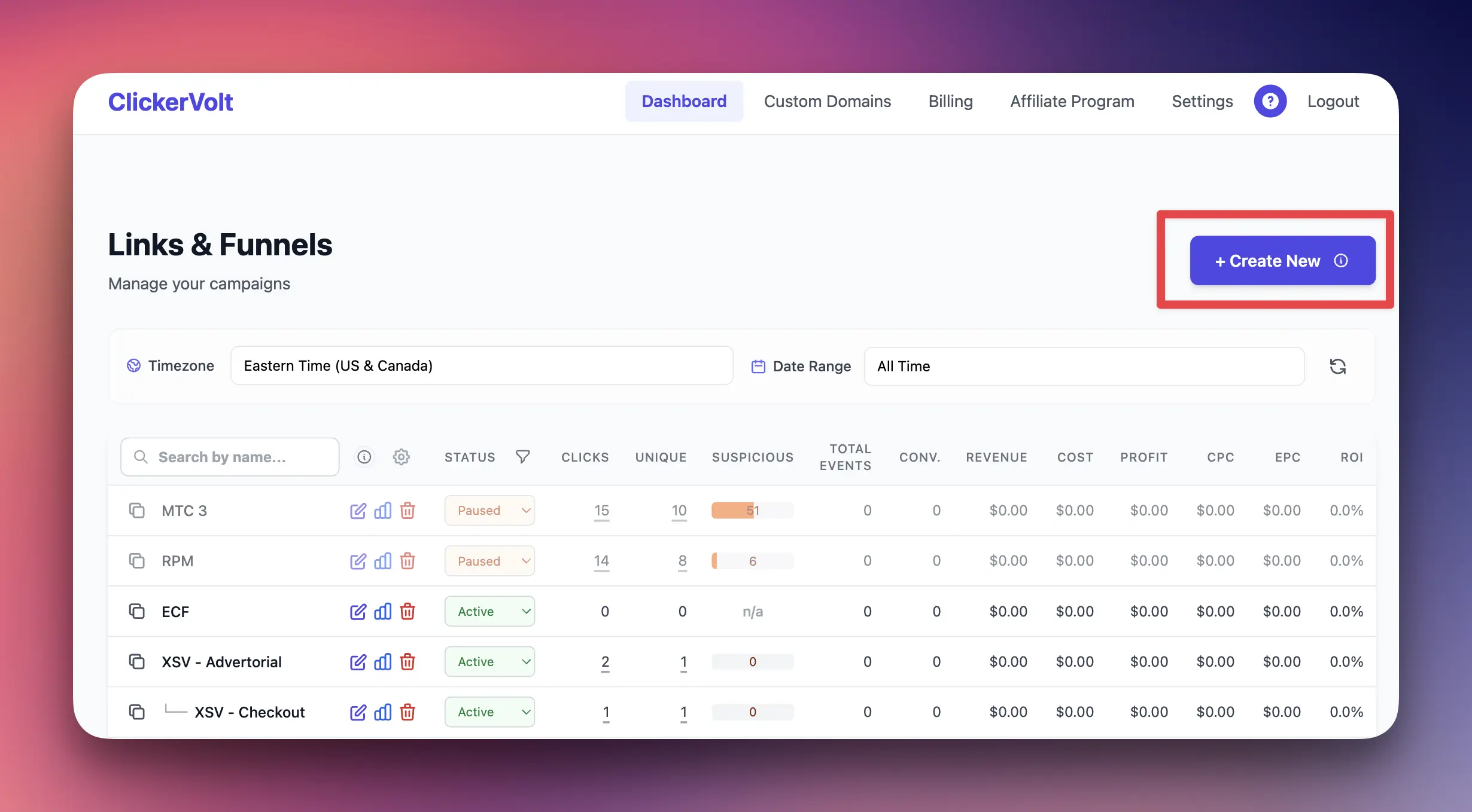 ClickerVolt will create your tracking link and take you back to the dashboard.